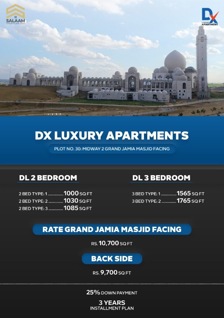 Our new project, Dx Luxury Apartments is in the heart of Bahria town Karachi with an astonishing view of Grand Jamia Moasjid. It offers a luxurious place to relax in an environment with wonderful views. It is situated on Midway Commercial 2, which is the ideal location. Dx Luxury Apartments can be seen even from a distance due to its central location and can be easily found. It is a 7-8 minutes distance from the Main gate.This building will have a separate and spacious area for parking and will offer every facility you could dream about. The building will have beautiful, lush greenery in its surroundings which will enhance its beauty further.